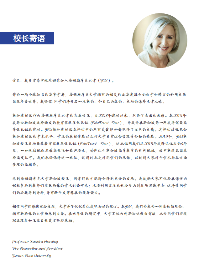 06师资力量詹姆斯库克大学新加坡校区有一支兢兢业业、经验丰富、高素质的教师队伍。大学任职的每一位全职教授、讲师都拥有博士及以上学历,并且同时全部受聘于澳大利亚校区。创新的教学风格结合最新的教学技术是詹姆斯库克大学教育理念的根基。