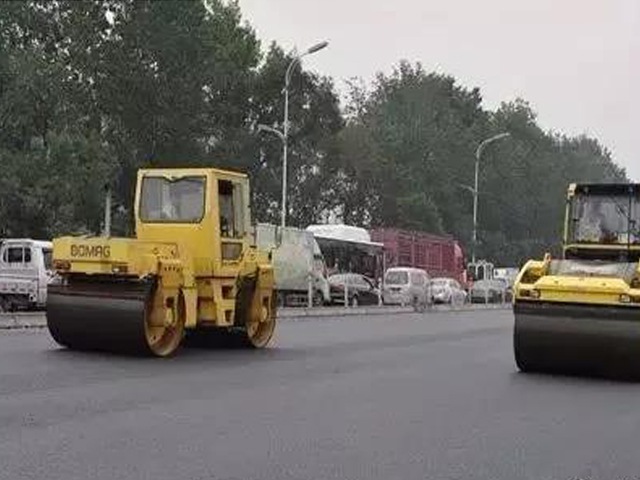 4、压实:初压—钢筒式或振动(关闭振动)压路机,静压1~2遍,驱动轮面向摊铺机碾压段≤80m、复压——钢筒式/振动/轮胎压路机,密集配沥青料—重型轮胎,粗骨料为主—振动压路机,层厚大的高频大振幅、终压—双轮钢筒式压路机,静压2遍;碾压厚度≤10cm,碾压温度根据沥青料种类、压路机、气温、层厚试压确定,压路机钢轮涂刷隔离剂或防粘 结剂,禁止刷菜油,压路机不得在为成型路段上掉头、转向、加水、停留,成型路面不得停放机械设备、洒落矿料油料