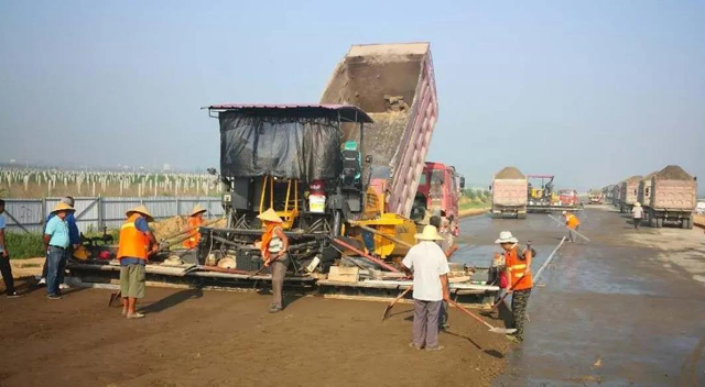 【2】摊铺施工。进行摊铺工作时,必须保证路面的平整度。这需要负责运输混合物料的车辆和摊铺机之间的协同工作。二者互相配合,才能保证路面的均匀平整。同时最少要备用一台摊铺机,以防出现摊铺机发生故障的突发情况,物料进行混合后摊铺工作往往难以停止,所以必须有备用方案。