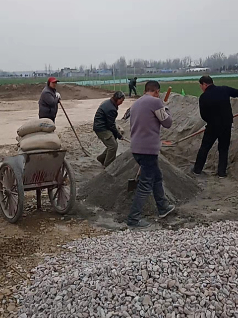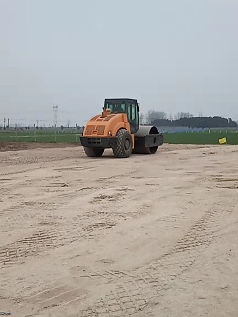 2月22日,S228项目临建场石碴上面,挖机铺沙子,压路机碾压现场。