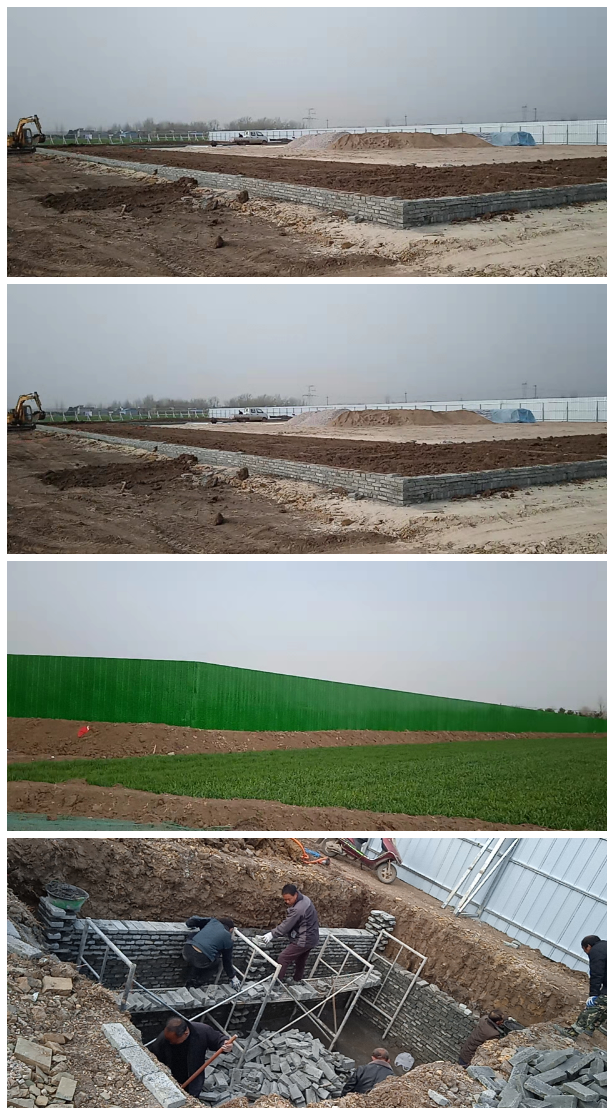 S228临建场地临建房基础砌筑完毕,基础内回填土正在进行及临建场地化粪池砌筑和厕所上下水安装现场。