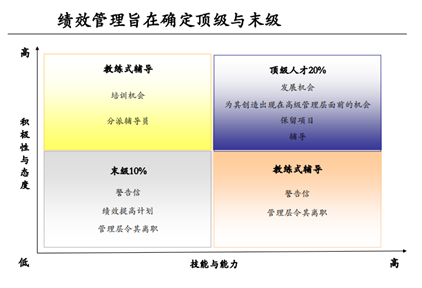对于那些积极性和态度很好,但是缺乏技能和能力的人,要给他一些培训。对于技能能力很好,但态度一般的人,也是给予一种教练辅导,但内容更多的是相对比较严重的警告等。对于那些技能态度各方面都不行的,可能又是另外一种管理方法。所以,绩效分级的目的就在此。
