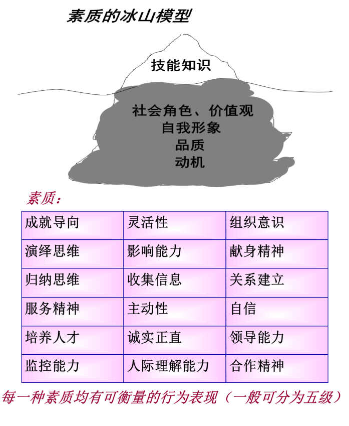 实际上,个人素质是决定个人绩效的关键所在,这是一个素质冰山模型,冰山之上的是知识技能,而冰山之下的社会角色、自我形象、价值、动机等,其实冰山之下的素质更重要,要发挥出来能力是不一样的。