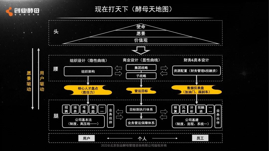 集团战略定下来保证不跑偏,当这个指标往下落的时候,要建立一套执行体系,最后落到地上,需要中台体系的支持。