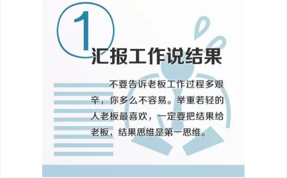 不要告诉老板工作过程多艰辛,你多么不容易!老板不傻,否则做不到今天。举重若轻的人老板最喜欢,一定要把结果给老板,结果思维是第一思维。