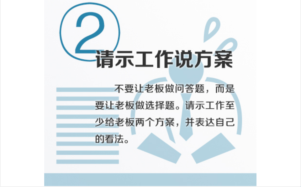 不要让老板做问答题,而是要让老板做选择题。请示工作至少保证给老板两个方案,并表达自己的看法。