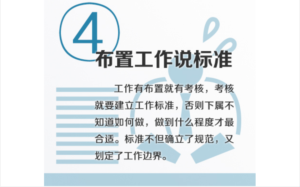 工作有布置就有考核,考核就要建立工作标准,否则下属不知道如何做,做到什么程度才是最合适的。标准既确立了规范,又划定了工作的边界。