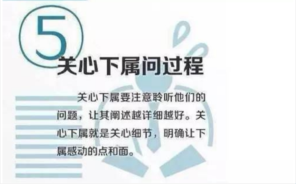 关心下属要注意聆听他们的问题,让其阐述越详细做好。关心下级就是关心细节,明确让下级感动的点和面。