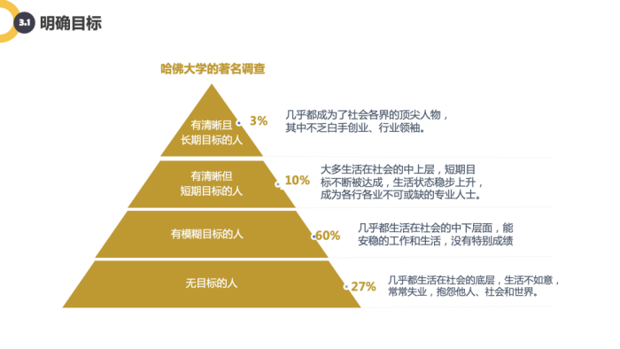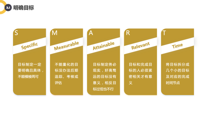 明确目标的重要性不言而喻,有了清晰的方向和目标,就有了明确的工作指引。对于自我管理,清晰的目标,起着决定性的作用。目标本身是要符合法则的,同时,当明确目标之后,还可以对目标进行分解。因此,对于目标的制定,要符合自身的需要。