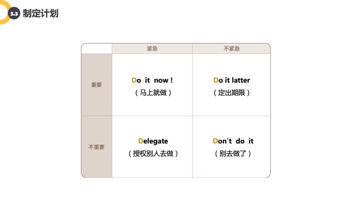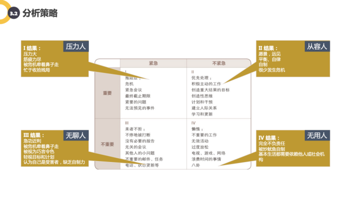 2)对于不同的打断,处理方式是不一样的。对待上级的打断:通常可以边工作边等待,要区分上级打断的事情是属于哪个象限;对待平级的打断:界定清楚权责,流程规范化;对待下级的打断:快速响应,约定沟通频率;对待外界的打断,比如外界的电话,短信等,可以调整电话和短信的音量,避免受到干扰(以电话为例,如果是紧急的事情,通常都是会有第二次来电)