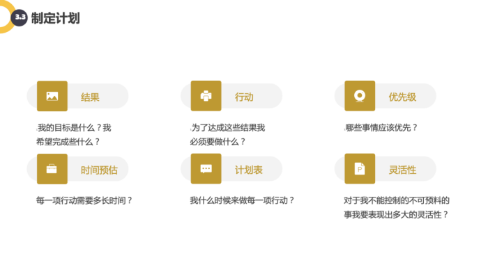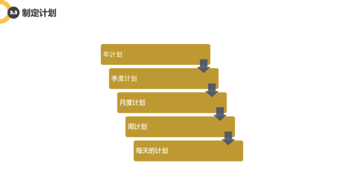 个人的精力和时间都是有限的,当目标和策略确定之后,需要有计划地完成目标。成功的基础是将目标转化为计划。这个过程中,需要先对目标进行分解,分解的过程其实也是制定计划的一部分。一个目标的达成,是需要被计划管着。当有了这个初步的计划,每个阶段的小目标都很明确,而且也有相应的时间。