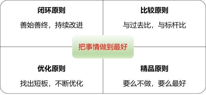 凡事都要善始善终,坚持使用PDCA循环(计划、实施、检查、改善),达到螺旋式上升的目的。职场中,起初都是行政,最终都是管理,每个人都是从事务性工作开始的,而每一项工作都离不开管理。只要有了PDCA意识,一个人也就有了质量意识。闭环原则是“把事情做到最好”的首要原则。