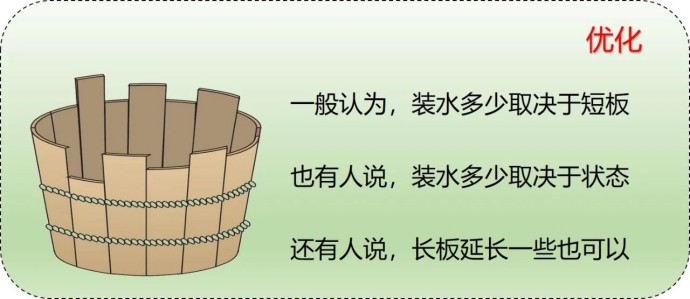 关于木桶理论,有三种看法:一般认为,装水多少取决于短板,也有人说,装水多少取决于状态,还有人说,长板延长一些也可以。总之不能僵化地看待“优化原则”。