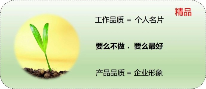 工作品质=个人形象,企业形象,要么不做,要么做好!坚持“数一数二”原则,即保持市场占有率第一或是第二的原则,但在组织内、在部门内、在团队内做到极致,应该是职场人的永恒追求。