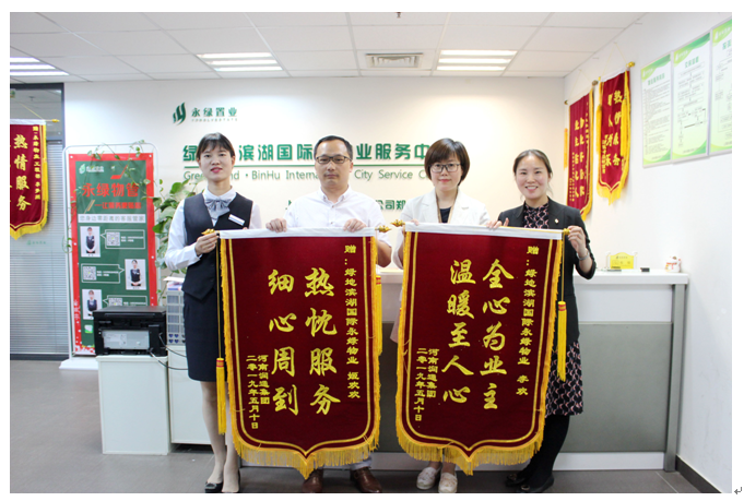 2019年 5月16日上午,河南润通集团、河南晓兰客车销售股份有限公司员工代表向滨湖国际永绿物业赠送锦旗,衷心感谢客户经理李欢、姬欢欢两位同志热忱周到的服务!