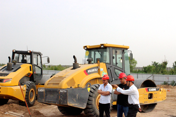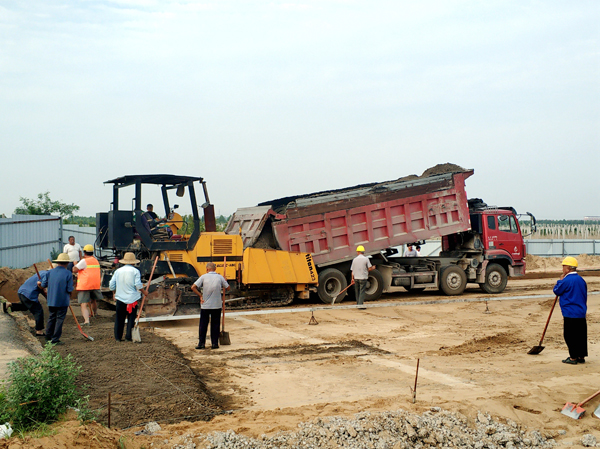 施工现场看到,摊铺机正在将风化砂和碎石混合而成的材料缓缓平摊在路基之上,随后,不同型号的压路机随时待命,等待夯实路面上的材料,工作在有条不紊的进行着。